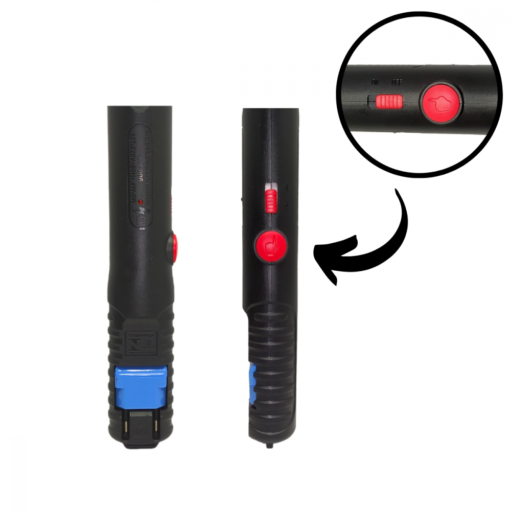 - Possui Led para indicar funcionamento e recarga (vermelho em funcionamento e verde quando está recarregando.